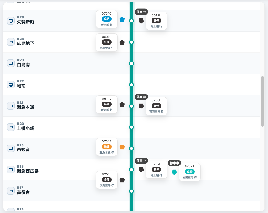 列車の行先や種別、走行/停車の状態が一目で確認できます。