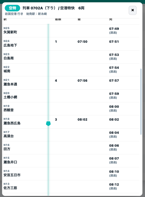 列車の走行位置、到着/発車時刻、乗り場(一部の駅のみ)が確認できます。